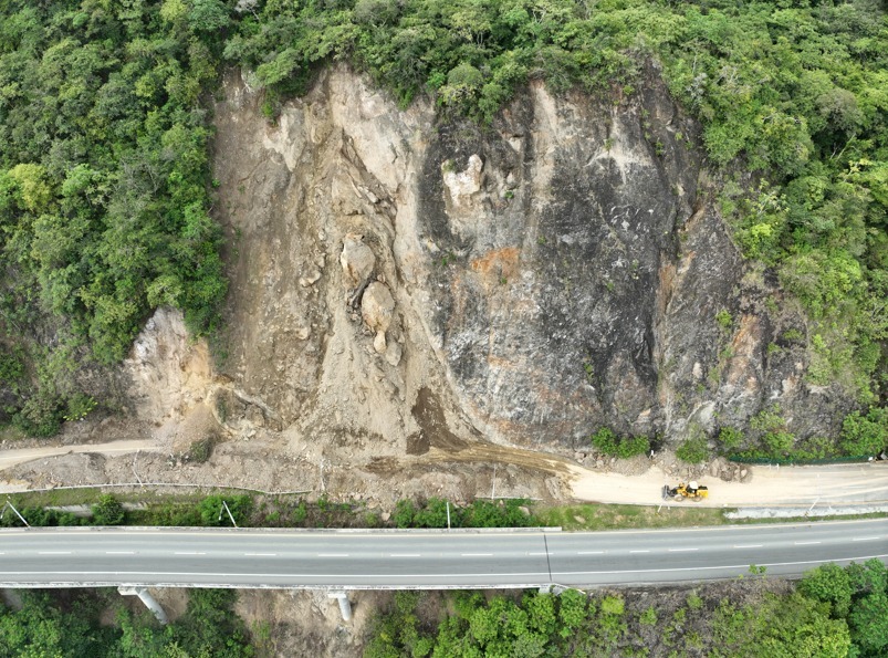 Temporalmente, como medida de mitigación, se colocó material en la parte inferior para prevenir posibles daños de la infraestructura ante el desprendimiento no controlado de los bloques rocosos que se encuentran en la parte superior del derrumbe.